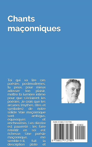 Toi qui va lire ces poésies postmodernes, tu peux, pour mieux adosser ton plaisir, mettre ta lumière intime pour que s’éclairent les poésies. Je crois que les arcanes (mythes, rites et symboles) de notre solide Voie maçonnique sont ambigus, équivoques et enchevêtrés. Les décrire est pauvreté ; les faire retentir en soi est richesse. Une poésie maçonnique, me semble-t-il, fuit la description plate et morne des dictionnaires. Elle pratique une obscurité de mots, de phrases, pour faire éprouver les émotions, comme tu les sens. Aussi, tu dévoileras dans ces textes quelques procédés que j’ai utilisés, un peu comme la lueur de l’Initiation : la bougie ne compte pas ; la flamme scintille dans l’âme, en profusion de sens, les tiens. Pour t’inspirer des émotions salvatrices dans ta Voie.
